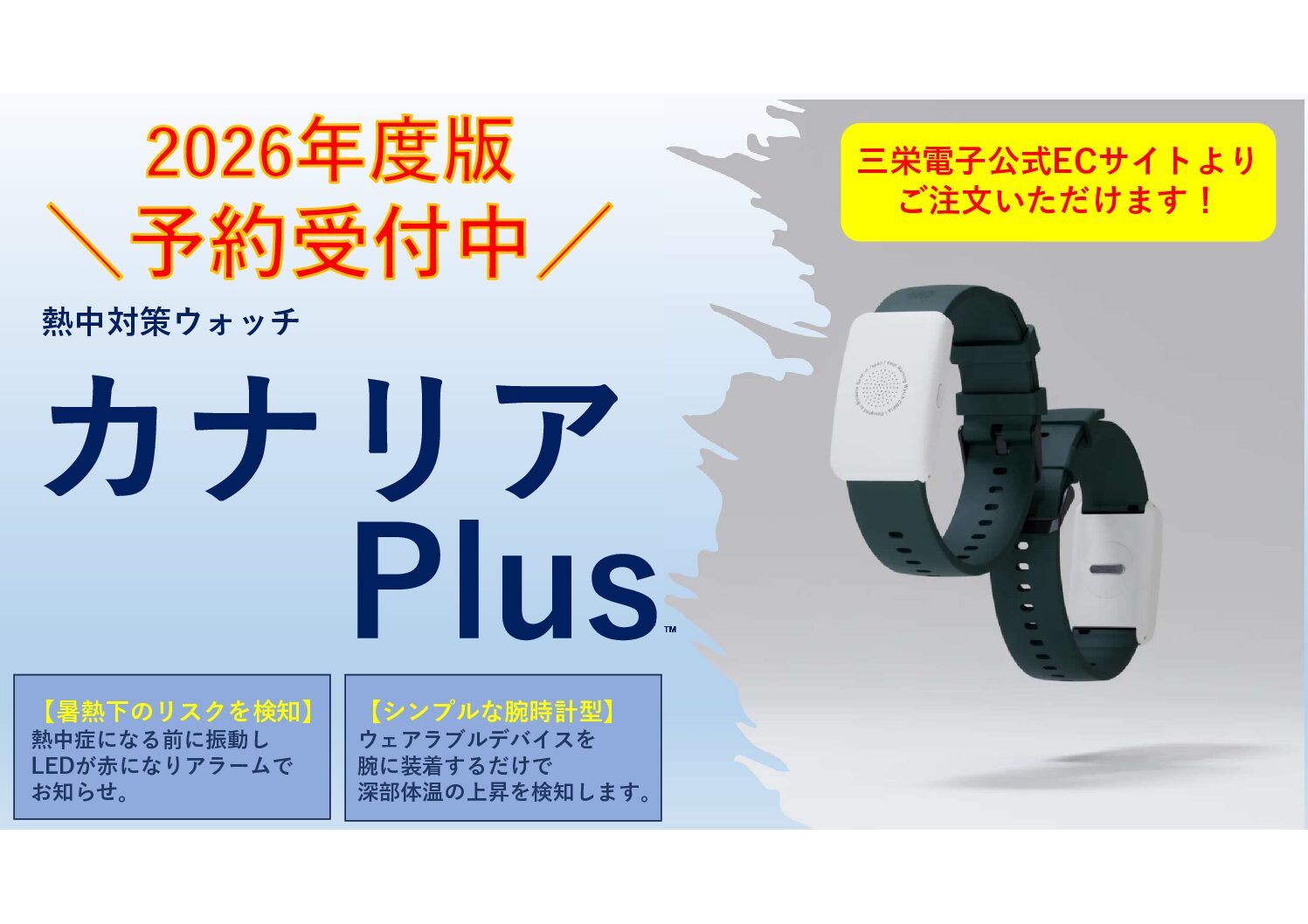 「熱中対策ウォッチ カナリア Plus」は、暑熱下のリスクを検知して、一大事になる前にアラームと